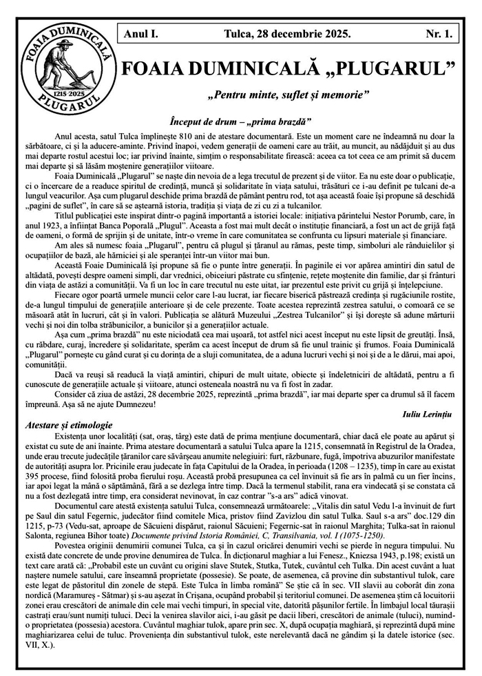 La Tulca, a apărut primul număr din Foaia duminicală ,,Plugarul”