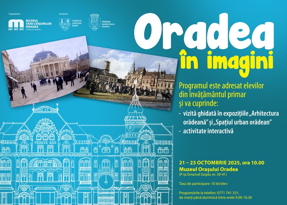 Muzeul Țării Crișurilor Oradea - Complex Muzeal, în parteneriat cu Consiliul Județean Bihor și Primăria Municipiului Oradea, organizează activitatea Oradea în imagini, dedicată descoperirii simbolurilor palatelor orădene, cu sprijinul imaginilor, al jocurilor și al fișelor de colorat....citeste |