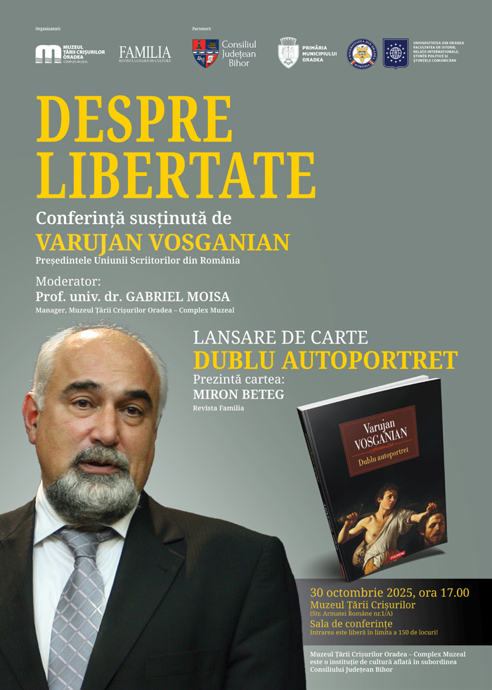 Muzeul Ţării Crişurilor Oradea - Complex Muzeal organizează împreună cu Revista Familia și în parteneriat cu Consiliul Județean Bihor, Primăria Municipiului Oradea și Facultatea de Istorie, Relații Internaționale, Științe Politice și Științele Comunicării a Universității din Oradea, conferința Despre libertate, susținută de Varujan Vosganian, președintele Uniunii Scriitorilor din România. Evenimentul va avea loc joi, 30 octombrie 2025, ora 17.00, în Sala de conferințe a Muzeului Țării Crișurilor (Str. Armatei Române nr. 1/A). ...citeste |