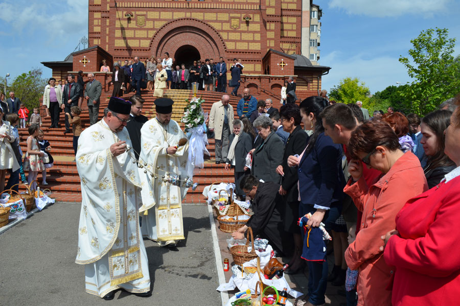 Duminică dimineața, începând cu ora 10.00, în biserica de sus, s-a săvârșit sfânta Liturghie din Ziua Învierii, iar la sfârșit, părintele vicar Vasile Bota și părintele dr. Ion Alexandru Mizgan au binecuvântat mâncărurile de dulce ale credincioșilor pe solea din fața bisericii.