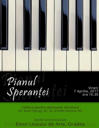 Astăzi, vineri, 7 aprilie 2017, ora 16.30, va avea loc al doilea eveniment marca ,,Pianul speranței", un concert la Căminul pentru persoane vârstnice din Salonta. Concertul va fi susținut de elevi ai Liceului de Arte din Oradea.