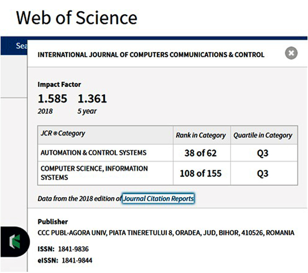 Conform clasificării Web of Science/ISI-JCR2018, revista ,,International Journal of Computers Communications & Control", http://univagora.ro/jour/index.php/ijccc/, editată de Universitatea Agora din Oradea, cu Factorul de Impact 1,585, este cea mai bună din România în domeniul Informatică/Calculatoare/IT, ocupând locul 6 în clasamentul general (toate domeniile): http://dzitac.ro/files/ijccc/JCR2018RO.pdf