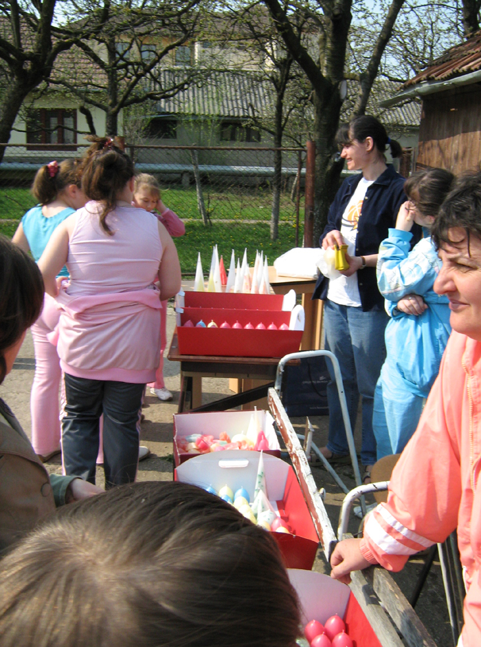 Sub razele soarelui de primăvară, tinerii cu sindrom Down și elevii școlii noastre s-au bucurat împreună de frumusețea lumânărilor expuse. (Lakatos Gyongyike)