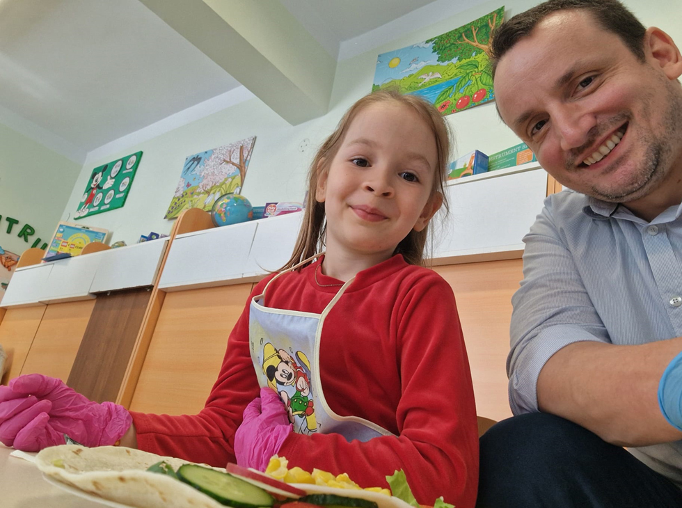 Copiii au așteptat cu nerăbdare sosirea tăticilor la grădiniță, moment în care ni s-a alăturat și domnul doctor nutriționist Sergiu Matei. Acesta ne-a dezvăluit două retețe pe cât de spectaculoase, pe atât de sănătoase - shaorma și cheesecake la pahar. În același timp, domnul doctor a oferit informații prețioase despre fiecare ingredient în parte, a dat explicații și a răspuns tuturor întrebărilor adresate de către publicul spectator. Copiii și tăticii au făcut echipă, au gătit și au savurat împreună delicioasele preparate.