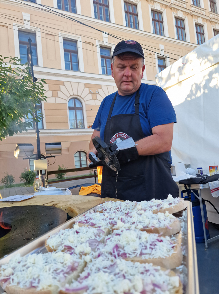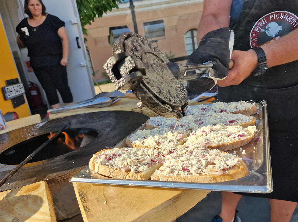 Apoi, ne-a lansat o provocare domnul Dan Păcală, cu ,,Pita picurată, marcă înregistrată", ca să-l cităm pe interlocutorul nostru: Pita este pâine tradițională provenită de la C.A.P. Salonta, iar felia este acoperită cu ceapă și brânză... peste care se picură untură fierbinte de la porc rasa Mangalița...