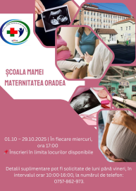 Maternitatea din cadrul Spitalului Clinic Județean de Urgență Bihor lansează „Școala mamei", o serie de cursuri dedicate viitoarelor mămici, care se vor desfășura pe parcursul a cinci întâlniri săptămânale, în perioada 1 - 29 octombrie 2025.