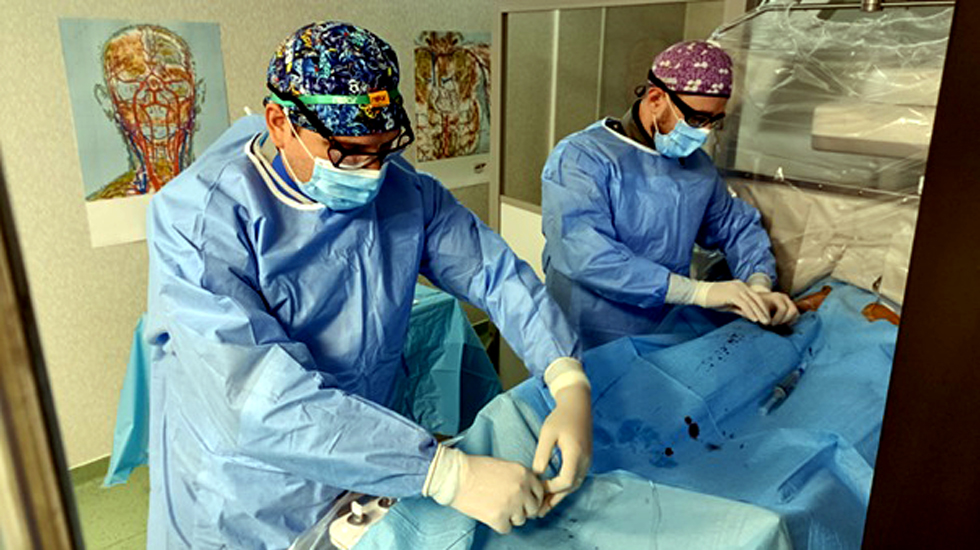 Foto 1: Imagine din sala de intervenții din timpul unei trombectomii mecanice (procedura endovasculară efectuată pentru a trata un AVC ischemic acut). (De la stânga la dreapta: Dr. Mihai GHERMAN, Dr. Dan MIHOC, Dr. Călin MORGOVAN)