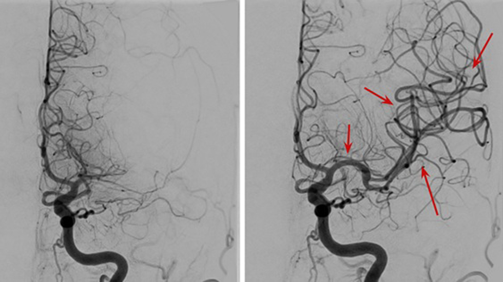 Foto 4: Imagine angiografică (DSA) înainte și după o procedura de trombectomie mecanică prin care s-a desfundat practic o artera cerebrală principală care se înfundase cu un cheag de sânge (AVC ischemic).