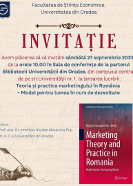 Facultatea de Științe Economice a Universității din Oradea organizează, sâmbătă, 27 septembrie 2025, de la ora 10.00, în Sala de conferințe a Bibliotecii Universității, un eveniment considerat de anvergură pentru lumea academică și mediul de afaceri: lansarea volumului „Marketing Theory and Practice in Romania - Model for the Developing World", editat de prof. univ. dr. emeritus Nicolae Alexandru Pop, doctor honoris causa al Universității din Oradea, figură emblematică a școlii de marketing românești.