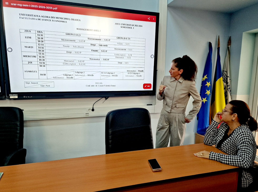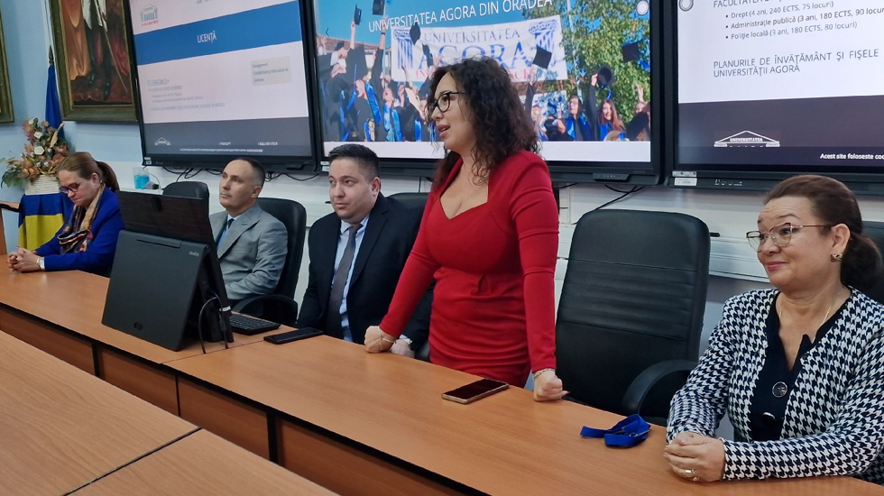 La Universitatea ,,Agora" din municipiul Oradea, deschiderea noului an universitar a avut loc, miercuri, 1 octombrie 2025, în Aula Albastră. După intonarea celor trei imnuri (,,Odă bucuriei", ,,Deșteaptă-te, române" și ,,Gaudeamus"), doamna președinte, profesor univ. dr. Adriana Manolescu, a adresat salutul de bun venit studenților și cadrelor didactice în noul an universitar și a prezentat membrii conducerii instituției, aflați în prezidiu: doamna conf. univ. dr. Alina Angela Manolescu - rectorul Universității ,,Agora", doamna conf. univ. dr. Gabriela Bologa - prorector, domnul lector univ. dr. Felix Popescu - prorector, doamna conf. univ. dr. Ramona Mihaela Urziceanu - președintele Senatului universitar și domnul conf. univ. dr. Casian Butaci - decanul Facultății de Științe Economice.