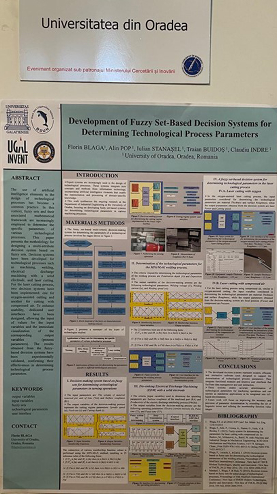 La acest eveniment național au participat și cadre didactice din cadrul Departamentului de Inginerie Industrială al Facultății de Inginerie Managerială și Tehnologică din cadrul Universității din Oradea, care au prezentat o lucrare ce sintetizează rezultatele cercetărilor privind utilizarea mulțimilor fuzzy pentru determinarea parametrilor tehnologici în diverse procese de prelucrare.
