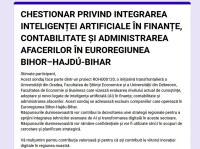 „Prin acest sondaj urmărim evaluarea nivelului actual de cunoștințe, adoptare și nevoi, legate de inteligența artificială (AI) în finanțe, contabilitate și administrarea afacerilor. Sondajul se adresează exclusiv companiilor care operează în Euroregiunea Bihor-Hajdú-Bihar. Răspunsurile vor rămâne confidențiale și vor fi utilizate strict în scopuri de cercetare și planificare strategică. Contribuția dumneavoastră va sprijini dezvoltarea unei strategii regionale pentru integrarea tehnicilor avansate de AI și accelerarea transformării digitale. Mulțumim pentru implicare și pentru sprijinul oferit viitorului inovației digitale în regiunea noastră!", a mai precizat prof. univ. dr. habil Diana Sabău Popa. (E.C.)