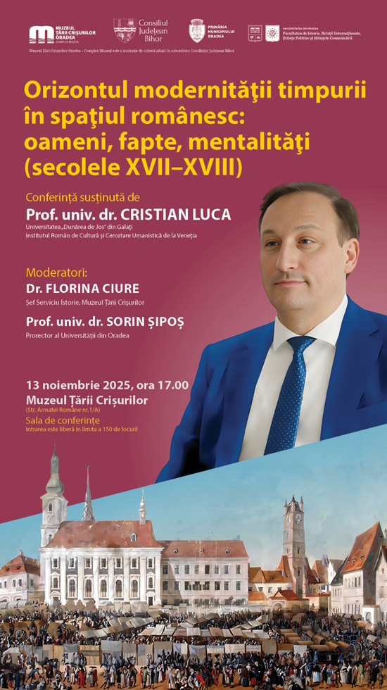 Muzeul Ţării Crişurilor Oradea - Complex Muzeal, în parteneriat cu Consiliul Judeţean Bihor, Primăria Municipiului Oradea şi Facultatea de Istorie, Relaţii Internaţionale, Ştiinţe Politice şi Ştiinţele Comunicării a Universităţii din Oradea, organizează conferinţa intitulată „Orizontul modernităţii timpurii în spaţiul românesc: oameni, fapte, mentalităţi (secolele XVII-XVIII)", susţinută de prof. univ. dr. Cristian Luca, director al Institutului Român de Cultură şi Cercetare Umanistică din Veneţia.