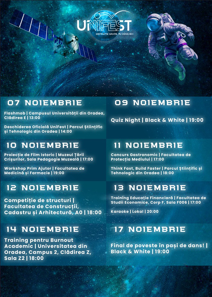 „Deschiderea festivalului este marcată de un FlashMob plin de energie, organizat în fața clădirii E a Universității din Oradea, unde studenții și asociațiile studențești sunt așteptați să dea tonul unei perioade vibrante, pline de zâmbete și voie bună", spune Ioana Iova, vicepreședintele USR zona de Vest și coordonator zonal al Festivalului UniFest.