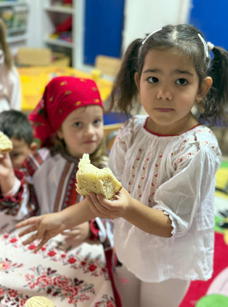 Considerăm că folclorul românesc este unul frumos și bogat și ne bucurăm că preșcolarii manifestă foarte mult interes și curiozitate față de activitățile de acest gen. Așa că am îmbrăcat, de la mic la mare, costumele populare, admirând și denumind fiecare parte a acestuia; apoi am dat ,,mână cu mână" pentru o horă mare, am modelat din plastilină steagul României, iar la sfârșit, am gustat din bucate tradiționale românești, copiilor fiindu-le pe plac mai ales pâinea caldă, proaspăt scoasă din cuptorul Vespan, Salonta.