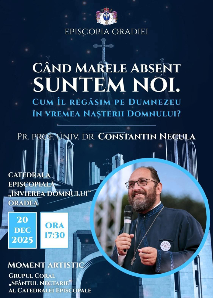 Aseară (20 decembrie 2025), Episcopia Ortodoxă Română a Oradiei ne-a pregătit în Casa lui Dumnezeu (Catedrala Episcopală ,,Învierea Domnului"), cu binecuvântarea Preasfințitului Părinte Episcop Sofronie, o mare bucurie duhovnicească, o întâlnire de suflet cu îndrăgitul Părinte profesor univ. dr. Constantin Necula, sub genericul ,,Când marele absent suntem noi. Cum îl regăsim pe Dumnezeu în vremea Nașterii Domnului"?