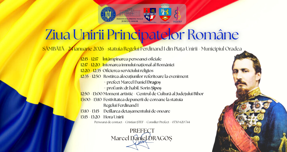 Evenimentul se va desfășura la STATUIA REGELUI FERDINAND I din PIAȚA UNIRII din MUNICIPIUL ORADEA, după următorul program: