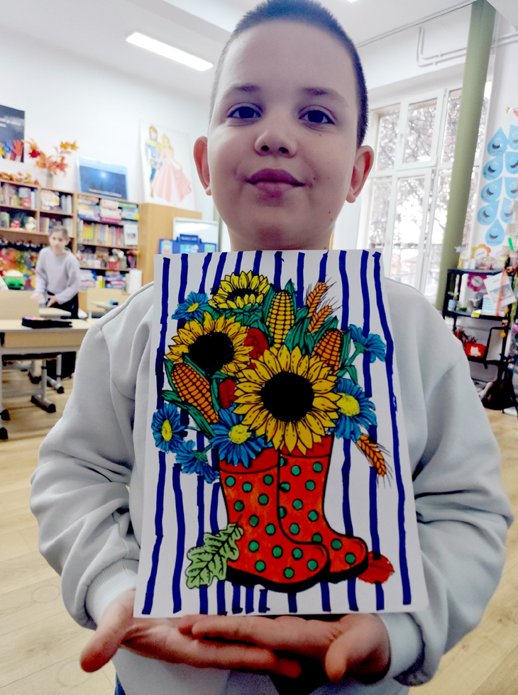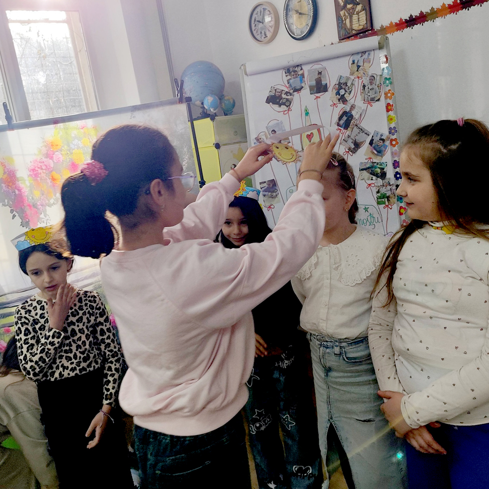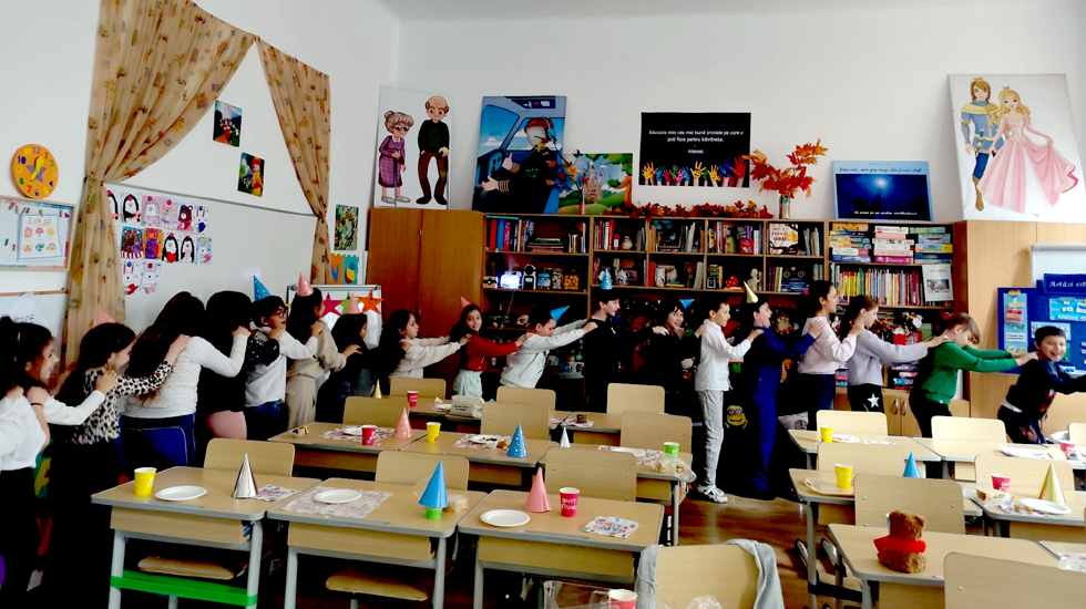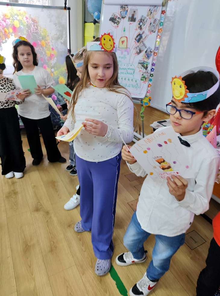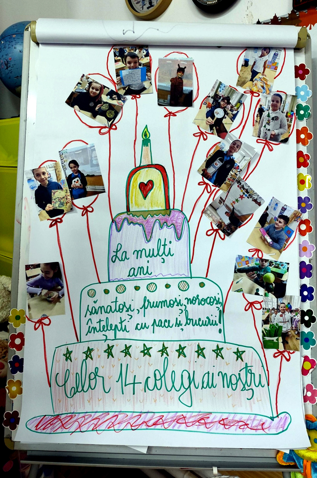 În paralel, ceilalți opt elevi ai clasei, împreună cu doamna învățătoare, au pregătit un afiș personalizat, coronițe, felicitări, baloane, ciocolată și un dar simbolic surpriză - cinci pânze miniaturale magnetizate pe care se poate picta și desena. Acest gest a încurajat generozitatea, cooperarea și bucuria de a dărui, valori esențiale în formarea caracterului copiilor.