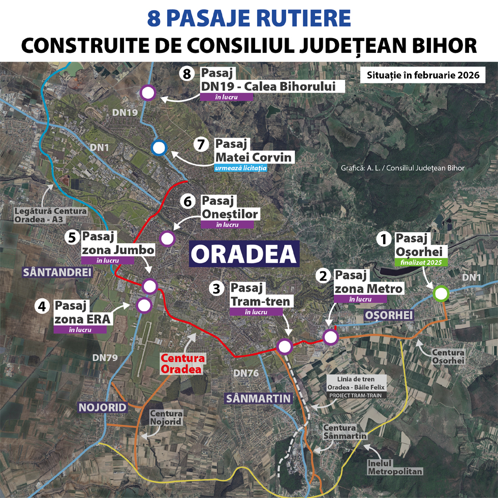 Luni, 2 februarie 2026, Consiliul Județean Bihor a emis ordinul de începere a lucrărilor la pasajul rutier suprateran de pe Centura Oradea, la intersecția cu calea ferată care leagă Oradea de Băile Felix.