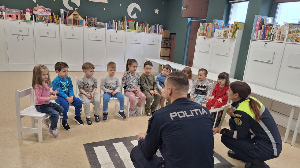 Cei mici au aflat care este rolul Poliției Române în comunitate și cum ne ajută polițiștii să fim în siguranță. Au recunoscut indicatoare rutiere importante, au învățat semnificația culorilor semaforului, cum să traverseze corect strada și cât de importantă este purtarea centurii de siguranță. De asemenea, au discutat despre reguli esențiale de siguranță personală, prin exemple expuse pe înțelesul copiilor. Momentul cel mai așteptat a fost prezentarea autospecialei de poliție și a echipamentului specific, care a stârnit mult entuziasm și curiozitate în rândul copiilor. Activitatea s-a încheiat cu un joc demonstrativ de traversare, unde cei mici au pus în practică noile cunoștințe, astfel au traversat strada de mână cu reprezentanții Poliției.