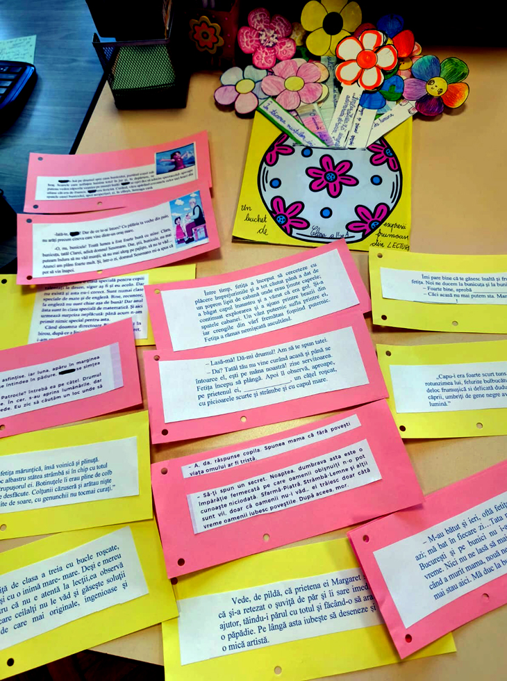 Mare parte din cărțile citite de noi sunt împrumutate de la biblioteca școlii, iar elevii au pregătit, în semn de mulțumire pentru doamna bibliotecară, un buchet de expresii frumoase din „Heidi"și din „Dumbrava minunată".  Scrise caligrafic, pe tulpini de flori, gândurile emoționante ale marilor autori au prins viață când fiecare copil le-a citit expresiv, cu voce tare.
