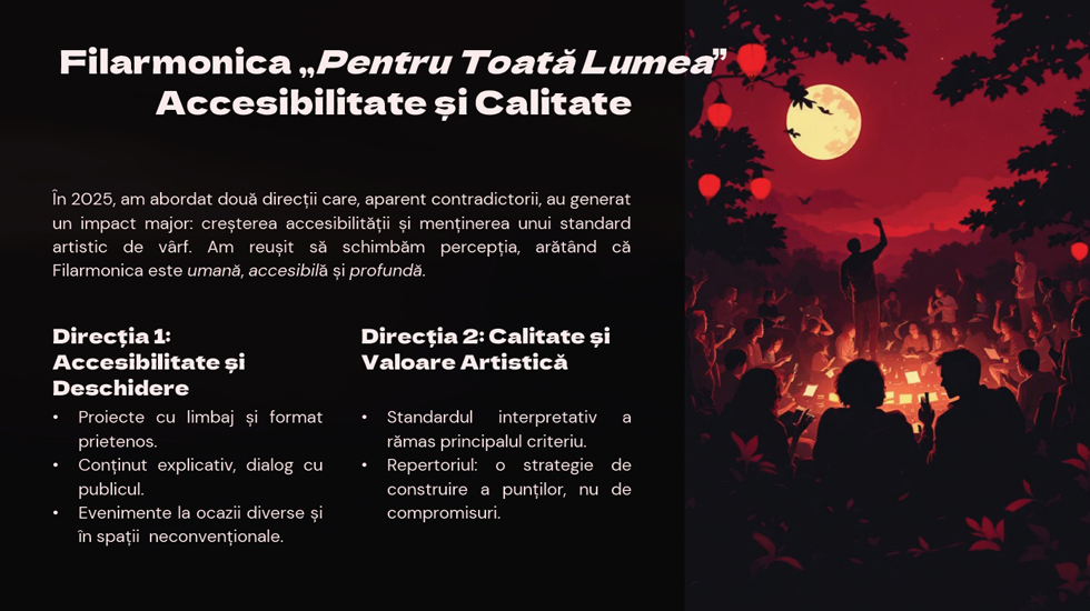 La rândul său, Carmen Rus a precizat că raportul nu a fost gândit „ca o formalitate", ci ca o prezentare a muncii unei echipe: „eu voi pune în fața dumneavoastră implicarea și munca unei întregi echipe de care sunt foarte mândră". Managerul Filarmonicii a arătat că 2025 „a fost un an de excelență și un an de inovație" și a accentuat rolul instituției în comunitate: „filarmonica nu trebuie tratată ca un lux, filarmonica este o necesitate".