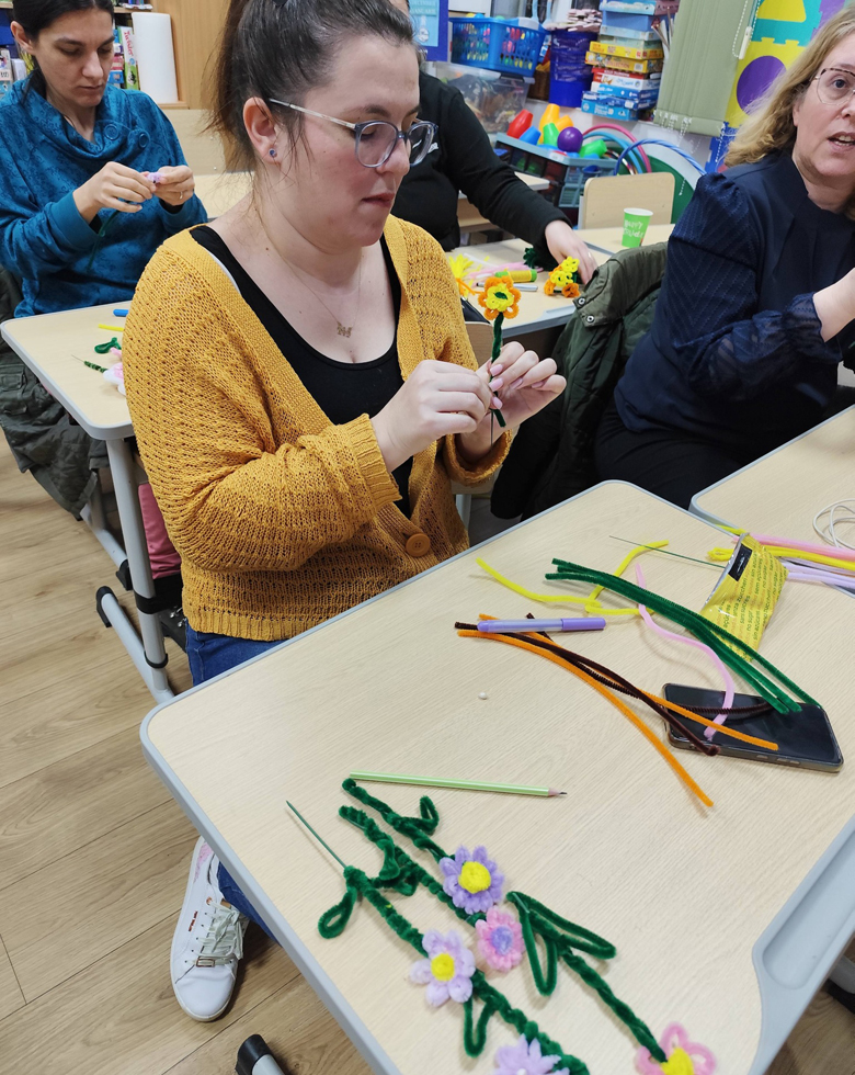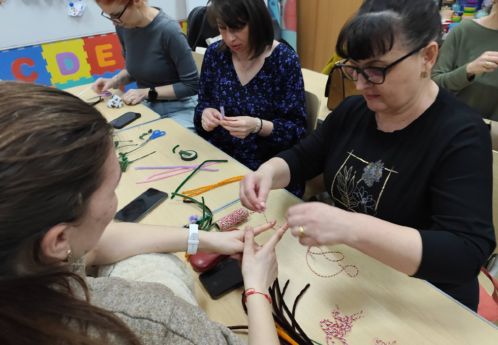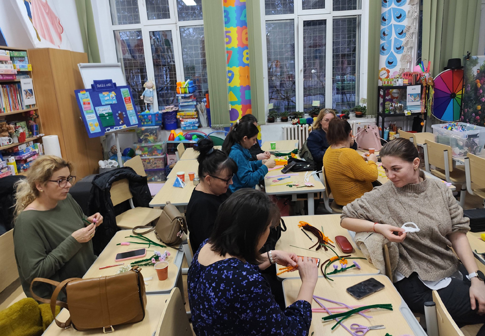 „Șezătoarea de la școală" a continuat această tradiție într-un cadru mai larg, transformând sala de clasă într-un adevărat atelier de creație. Mămicile și bunicile participante au venit cu entuziasm, materiale și idei, iar copiii au lucrat cot la cot cu ele, învățând prin exemplu răbdarea, atenția la detalii și bucuria colaborării. Înaintea Târgului de Crăciun, clasa s-a umplut de culoare și voie bună: s-au confecționat coronițe, podoabe pentru brad, aranjamente festive și mici daruri simbolice. Înaintea Târgului Mărțișoarelor, mesele au fost acoperite de șnururi alb-roșii, flori delicate, buburuze, trifoi și alte simboluri ale primăverii, toate lucrate manual cu migală. Atmosfera a fost una de autentică șezătoare: povești, sfaturi, râsete și mâini harnice lucrând împreună pentru un scop nobil.