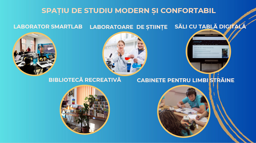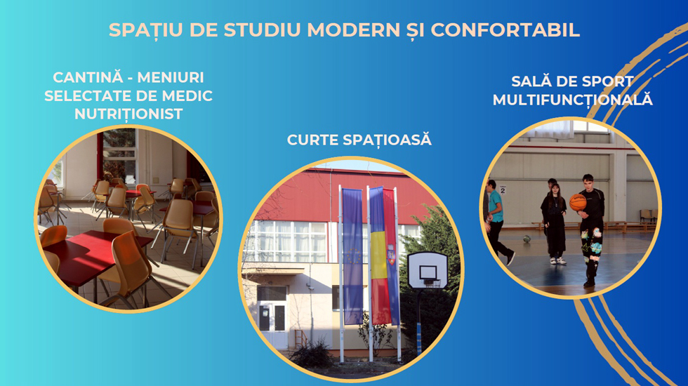 Campusul școlii, situat într-o locație centrală, oferă elevilor condiții moderne de studiu și relaxare. Cantina asigură un meniu echilibrat, realizat sub îndrumarea medicului nutriționist, biblioteca dispune de un spațiu recreativ pentru lectură și relaxare, iar sala de sport este dotată modern.