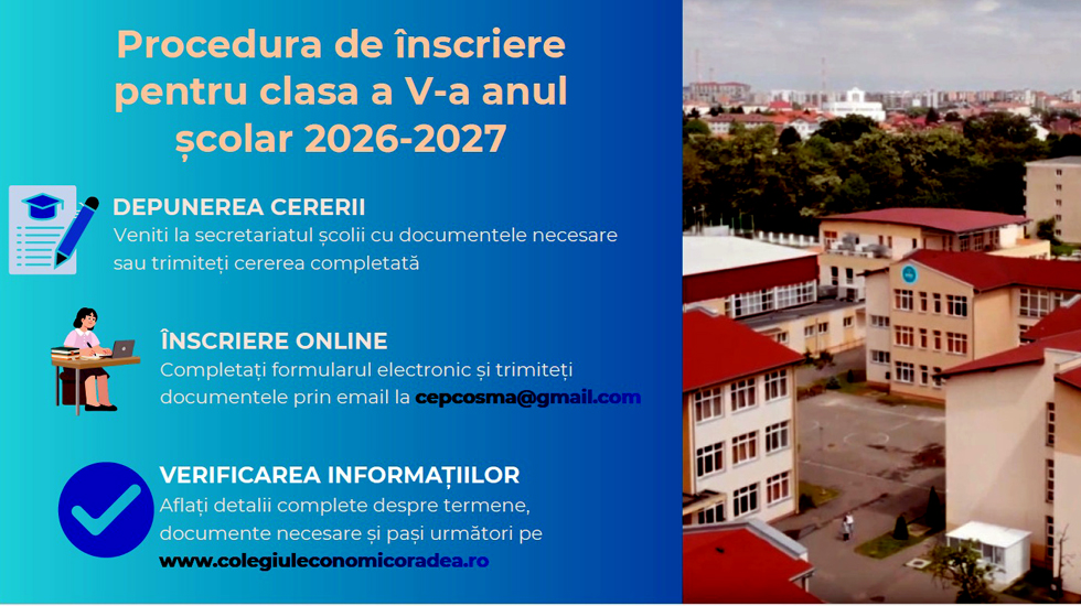 Descoperă viitorul copilului tău la Colegiul Economic „Partenie Cosma" Oradea - clasa a V-a Căutați o școală care să îmbine performanța academică cu grija pentru dezvoltarea armonioasă a copilului tău? Colegiul Economic „Partenie Cosma" Oradea deschide porțile unei noi oportunități educaționale pentru învățământul gimnazial - clasele V-VIII, într-un mediu modern, sigur și motivant.