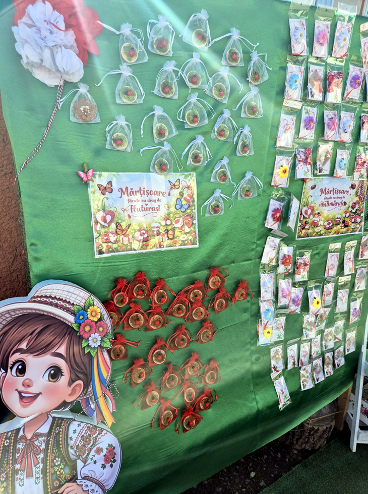 Mărțișoarele expuse au fost realizate cu multă migală și imaginație: flori, inimioare, buburuze și alte simboluri ale primăverii, toate confecționate din materiale diverse și decorate cu șnur alb-roșu. Nu au lipsit de la târg, nici mărțișoarele comestibile, pe care micii antreprenori le-au realizat din produse de patiserie ce s-au pretat a fi preparate cu ușurință sau din cele pe care au reușit să le decoreze creativ, ocazie ideală pentru etalarea talentului de cofetari.  Copiii au fost mândri să își prezinte creațiile și să le expună spre vânzare celor dragi, exersându-și astfel abilități antreprenoriale, dobândite în activitățile proiectului „De la joc...la educația financiară".