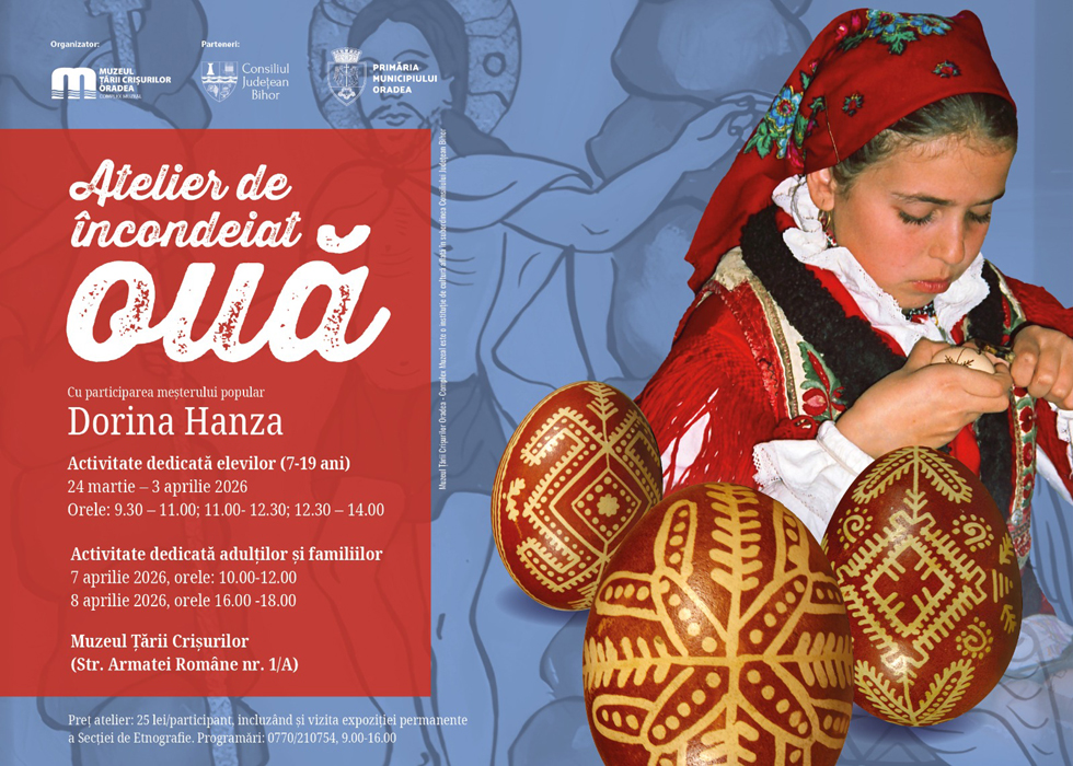 Muzeul Țării Crișurilor Oradea - Complex Muzeal, în parteneriat cu Consiliul Județean Bihor și Primăria Municipiului Oradea, organizează, cu ocazia sărbătorilor pascale, Atelierul de încondeiat ouă, dedicat școlarilor (7-19 ani), adulților și familiilor care doresc să se familiarizeze cu tehnica tradițională a acestui meșteșug.