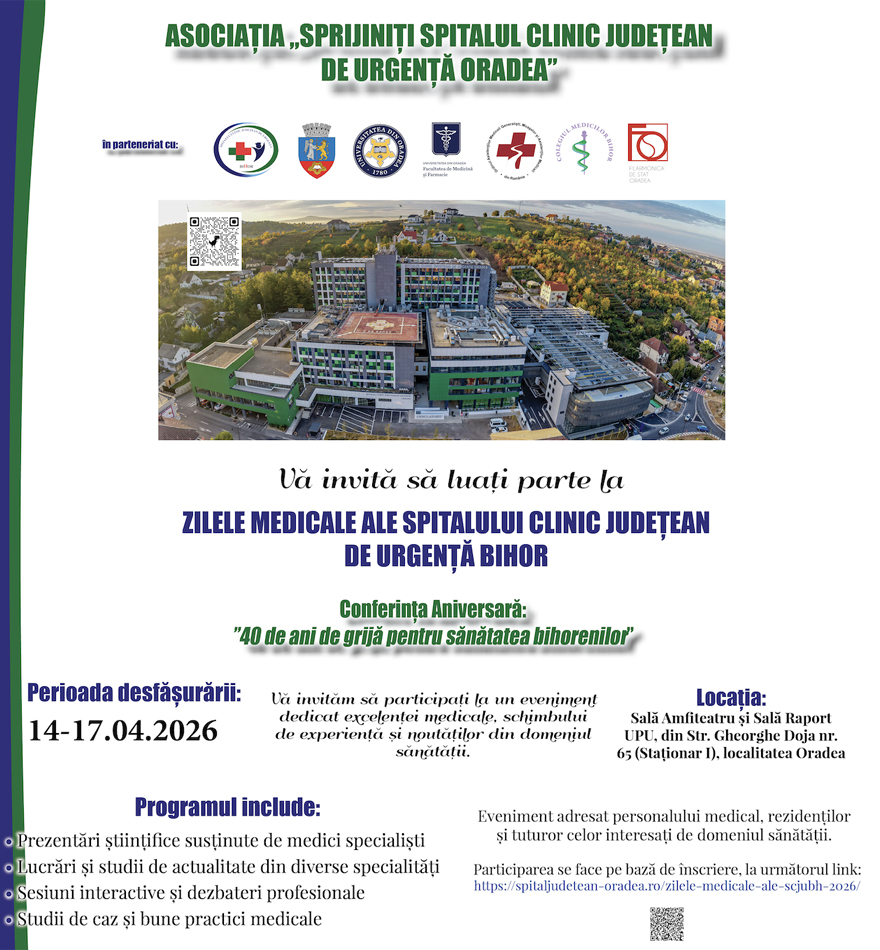 Asociația „Sprijiniți Spitalul Clinic Județean de Urgență Oradea", în parteneriat cu Spitalul Clinic Județean de Urgență Bihor, Primăria Municipiului Oradea, Universitatea din Oradea - Facultatea de Medicină și Farmacie, Colegiul Medicilor Bihor, Ordinul Asistenților Medicali Generaliști, Moașelor și Asistenților Medicali din România și Filarmonica de Stat Oradea, anunță organizarea evenimentului: Zilele Medicale ale Spitalului Clinic Județean de Urgență Bihor, în perioada 14-17 aprilie 2026.