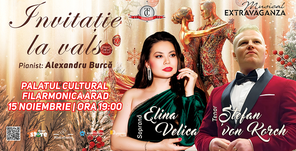După succesul din Gala Elitelor Arădene, tenorul Ştefan von Korch şi soprana Elina Velica revin la Arad, pentru un spectacol feeric în paşi de vals, o reinterpretare a balului de deschidere a sezonului sărbătorilor: în seara de 15 noiembrie, în stagiunea Musical Extravaganza, luminile se vor aprinde peste eleganța unei epoci apuse, iar Filarmonica Arad va deveni scena unui recital de poveste. Tenorul gazdă Ştefan von Korch şi soprana Elina Velica vor pofti publicul să li se alăture într-o frumoasă „Invitaţie la vals", spectacolul în care muzica și dansul se împletesc într-o veritabilă feerie de sărbătoare. Magia va fi întregită de prezenţa la pian a mestrului Alexandru Mihai Burcă.