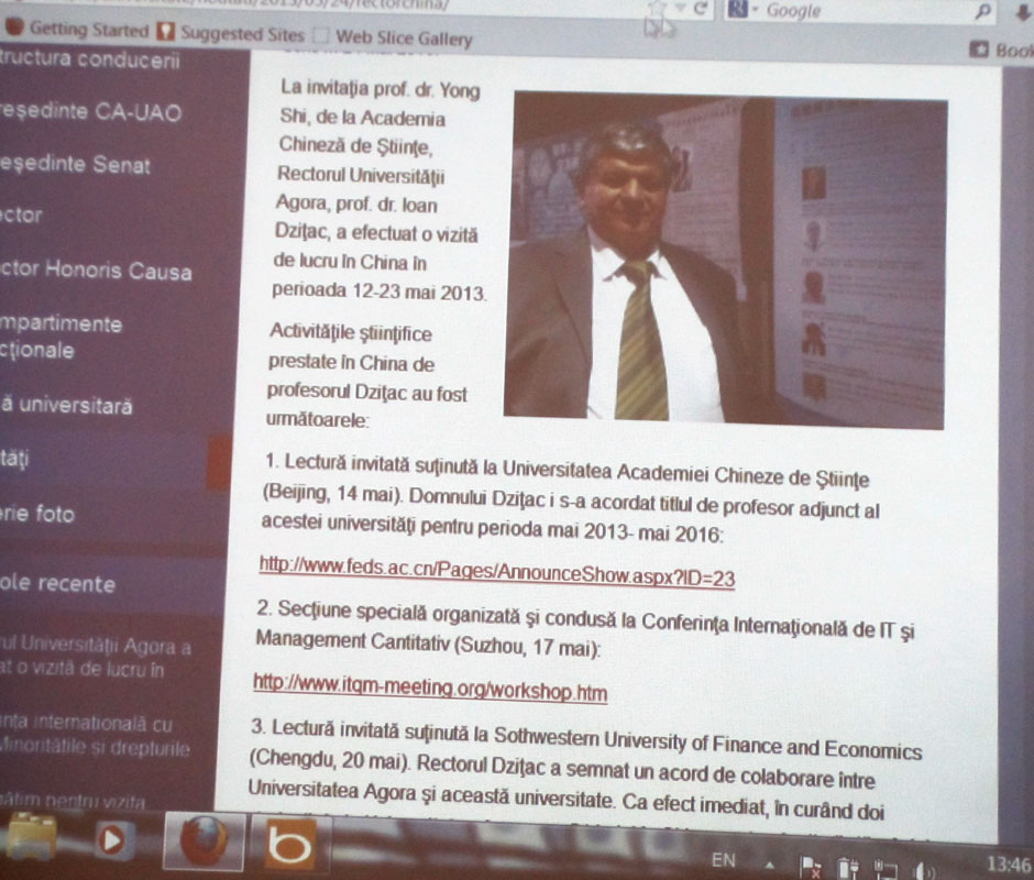În rezumatul prezentat, însoțit de imagini concludente, dl rector Ioan Dzițac s-a oprit la cele mai importante momente ale vizitei: prima activitate științifică la care a participat a fost o lectură invitată la Universitatea Academiei Chineze de Științe, unde au susținut lecturi cinci invitați: dl academician Gheorghe Filip, doi profesori din Rusia, și Brazilia, dl rector Ioan Dzițac și un profesor din S.U.A. (de origine chineză). Toți cei cinci profesori au primit onorarii pentru conferință (câte 250 de euro), fiind numiți profesori adjuncți ai Școlii de Management a Universității Chineze de Științe. Aceasta s-a întâmplat la Beijing - capitala Chinei, în 14 mai 2013, un oraș cu 25 de milioane de locuitori.