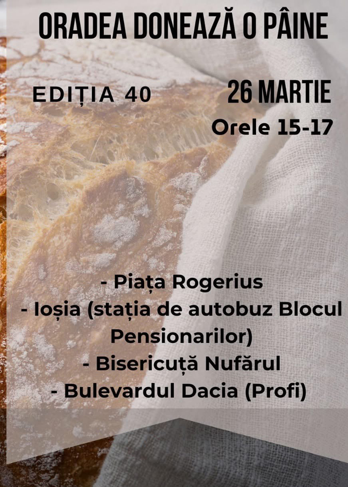 Ediția cu numărul 40 a proiectului ,,Oradea donează o pâine" se va desfășura joi, 26.03.2026, între orele 15-17....citeste