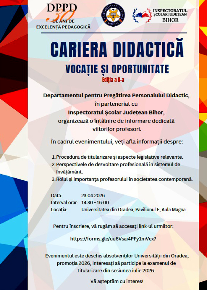 Departamentul pentru Pregătirea Personalului Didactic, în parteneriat cu Inspectoratul Școlar Județean Bihor, organizează o întâlnire de informare dedicată viitorilor profesori....citeste
