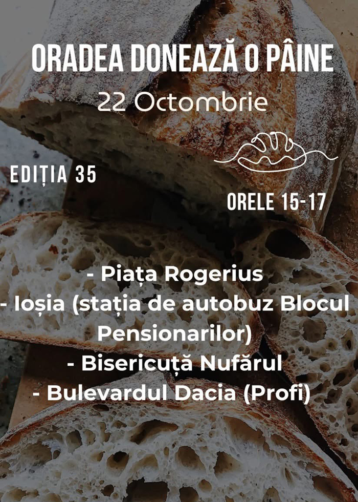 Vă anunțăm că ediția 35 a evenimentului „Oradea donează o pâine", se va desfășura miercuri, în data de 22 octombrie 2025, între orele 15.00-17.00, în patru locații: Piața Rogerius, Ioșia (stația de autobuz-Blocul Pensionarilor), Bisericuța Nufărul și Bulevardul Dacia (Profi)....citeste