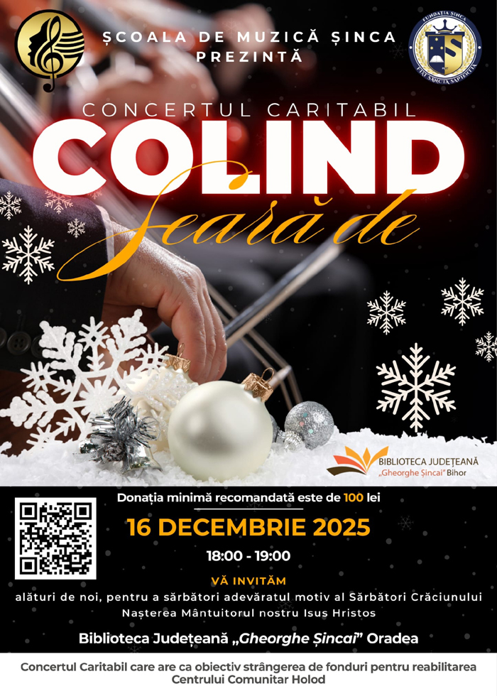 Începând de joi, 11 decembrie 2025, se pot rezerva biletele pentru concertul ,,Colinde tradiționale în haine de sărbătoare", susținut de maestrul Ioan Bocșa împreună cu Ansamblul „Icoane". Concertul va avea loc la Teatrul de Stat „Regina Maria" din Oradea, joi, 18 decembrie 2025, de la ora 18.00....citeste