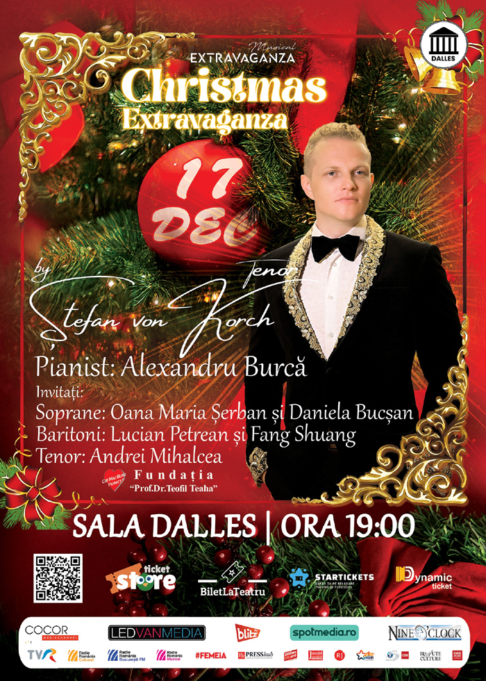 Împreună cu solistul gazdă al seriei Musical Extravaganza, tenorul Ştefan von Korch, sopranele Oana Maria Şerban şi Daniela Bucşan, tenorul Andrei Mihalcea, baritonii Fang Shuang şi Lucian Petrean şi pianiştii Alexandru Burcă şi Marius Groza sunt cei care vor transforma seara într-o feerie de sărbători, cu muzică de sezon de pe toate meridianele....citeste