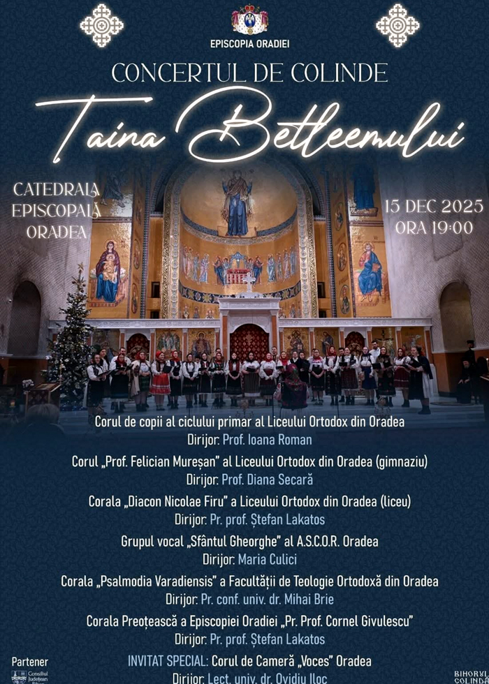 Episcopia Ortodoxă Română a Oradiei organizează luni, 15 decembrie 2025, de la ora 19.00, la Catedrala Episcopală ,,Învierea Domnului", din Oradea, cu binecuvântarea Preasfințitului Părinte Sofronie, Episcopul Oradiei, concertul de colinde ,,Taina Betleemului"....citeste